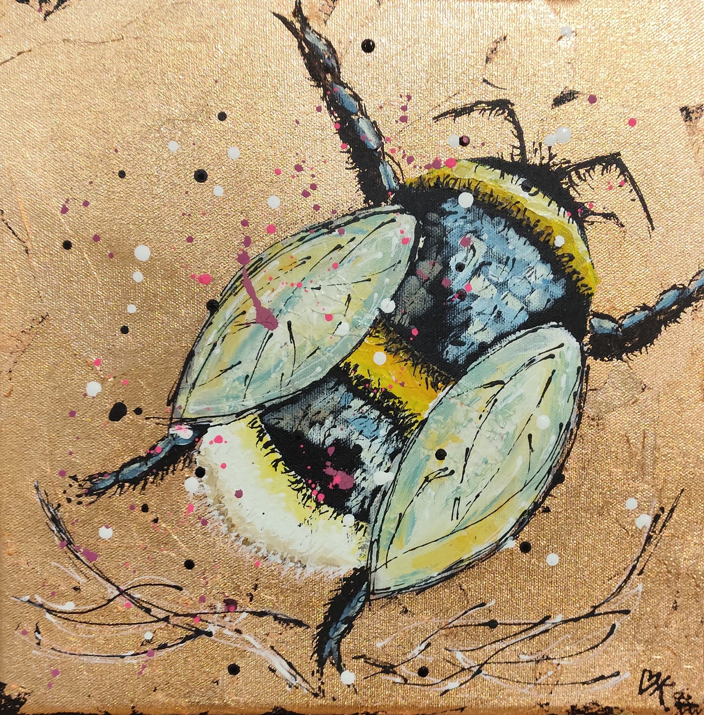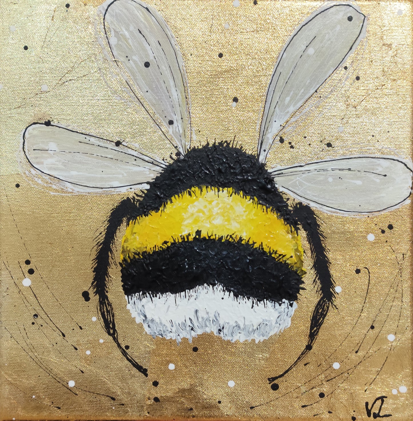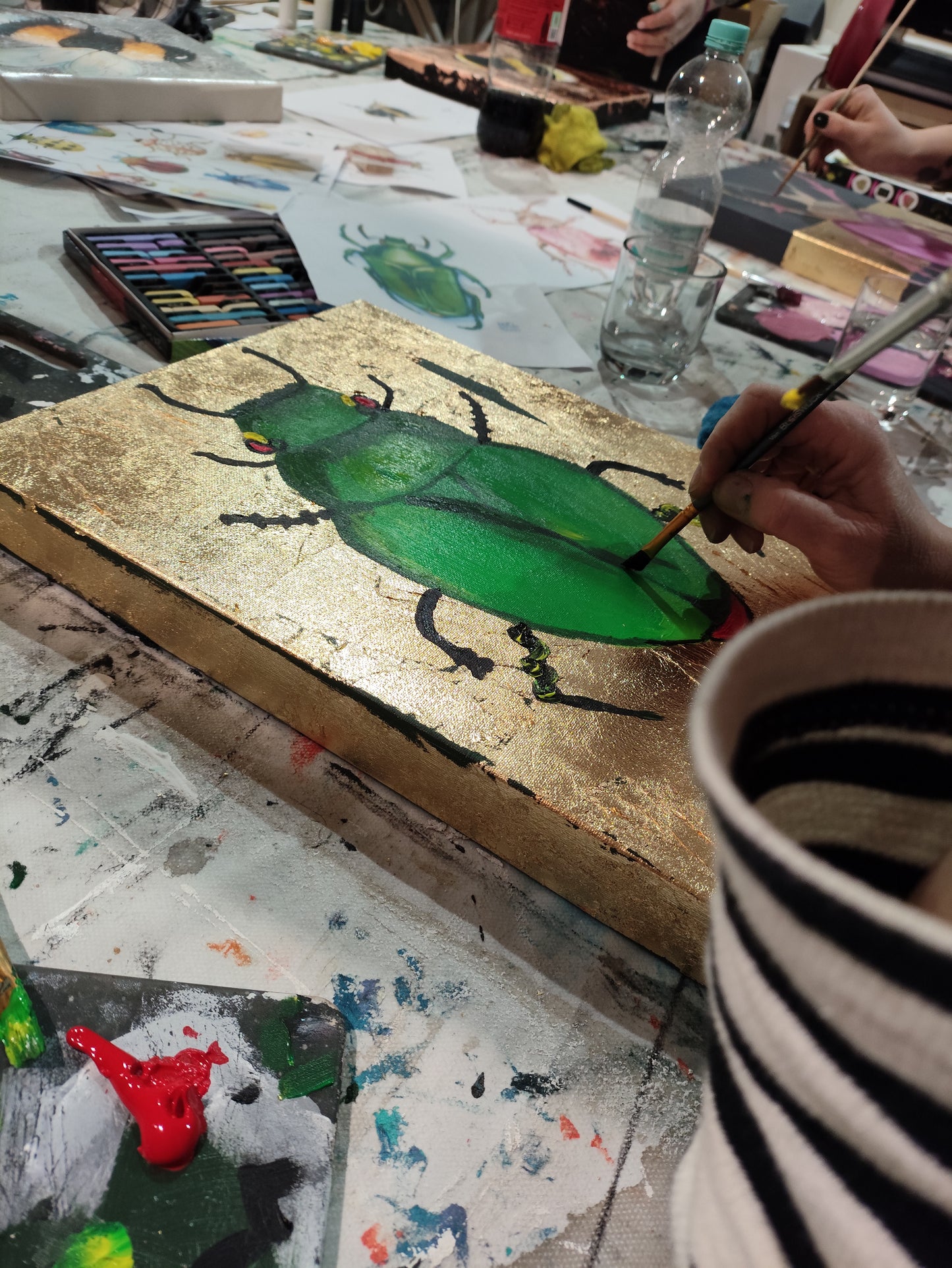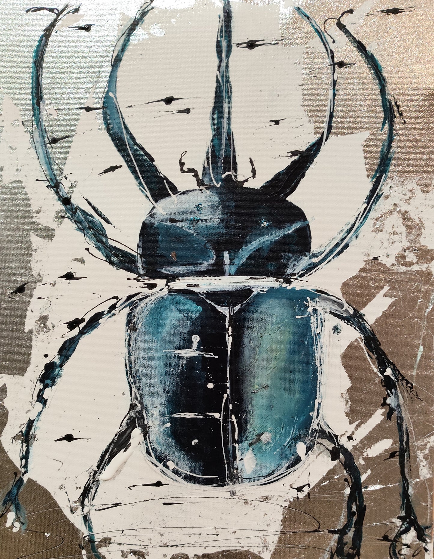 Diesen Abend widmen wir den fleißigen Bienchen und den niedlichen Insekten. Ihr könnt aus verschiedenen Insekten wie Bienchen, Hummeln oder Käfern auswählen. Für dieses Bild experimentieren wir mit abstrakter Malerei und dickem Farbauftrag auf einem Untergrund aus Blattmetall. Ob edel in Gold oder frisch in Silber, das entscheidet ihr nach eurem eigenen Geschmack. Wer möchte, darf auch kleckern, klecksen und sich austoben.