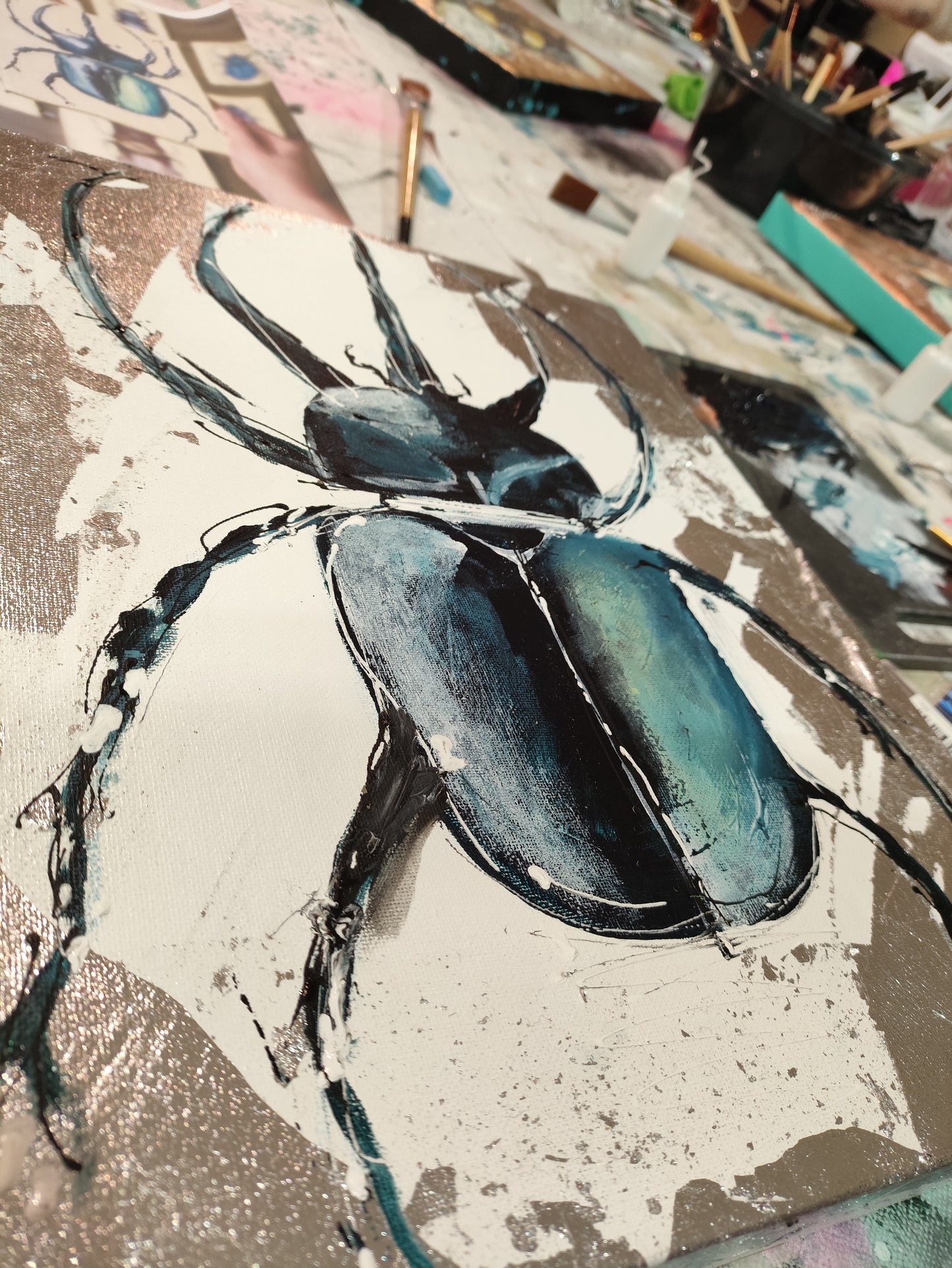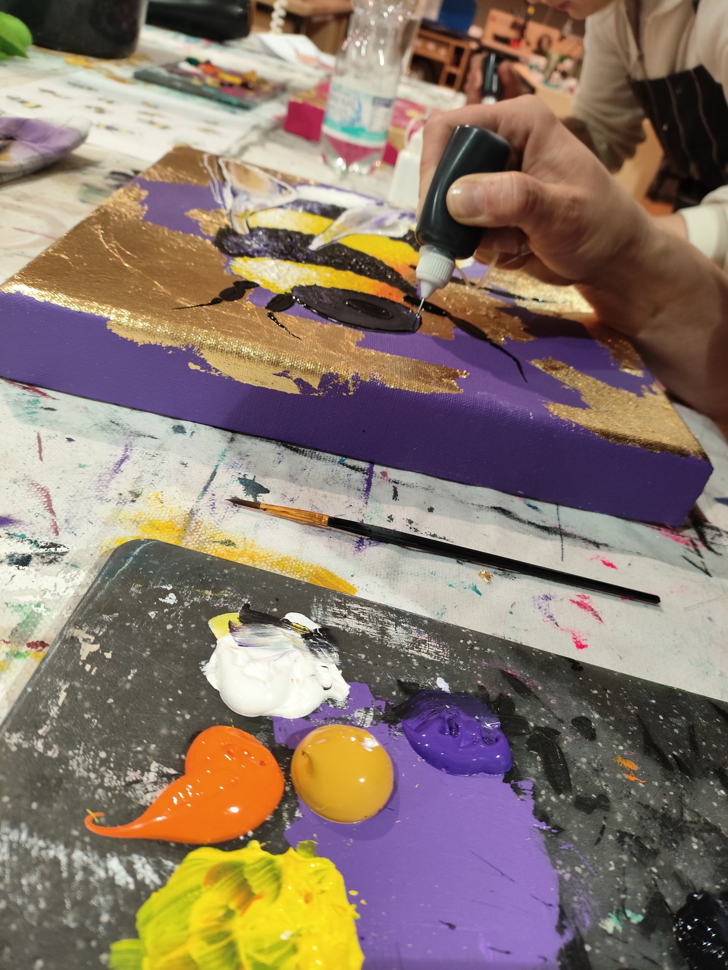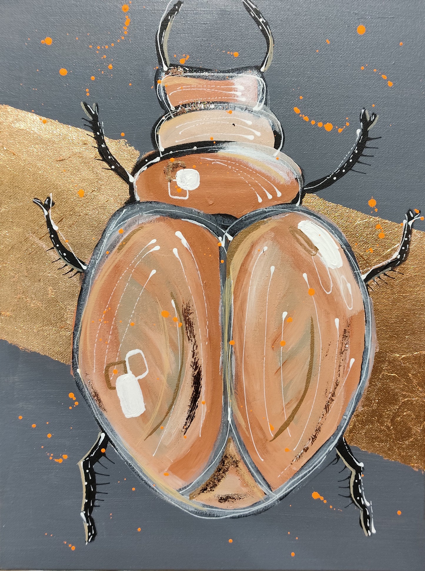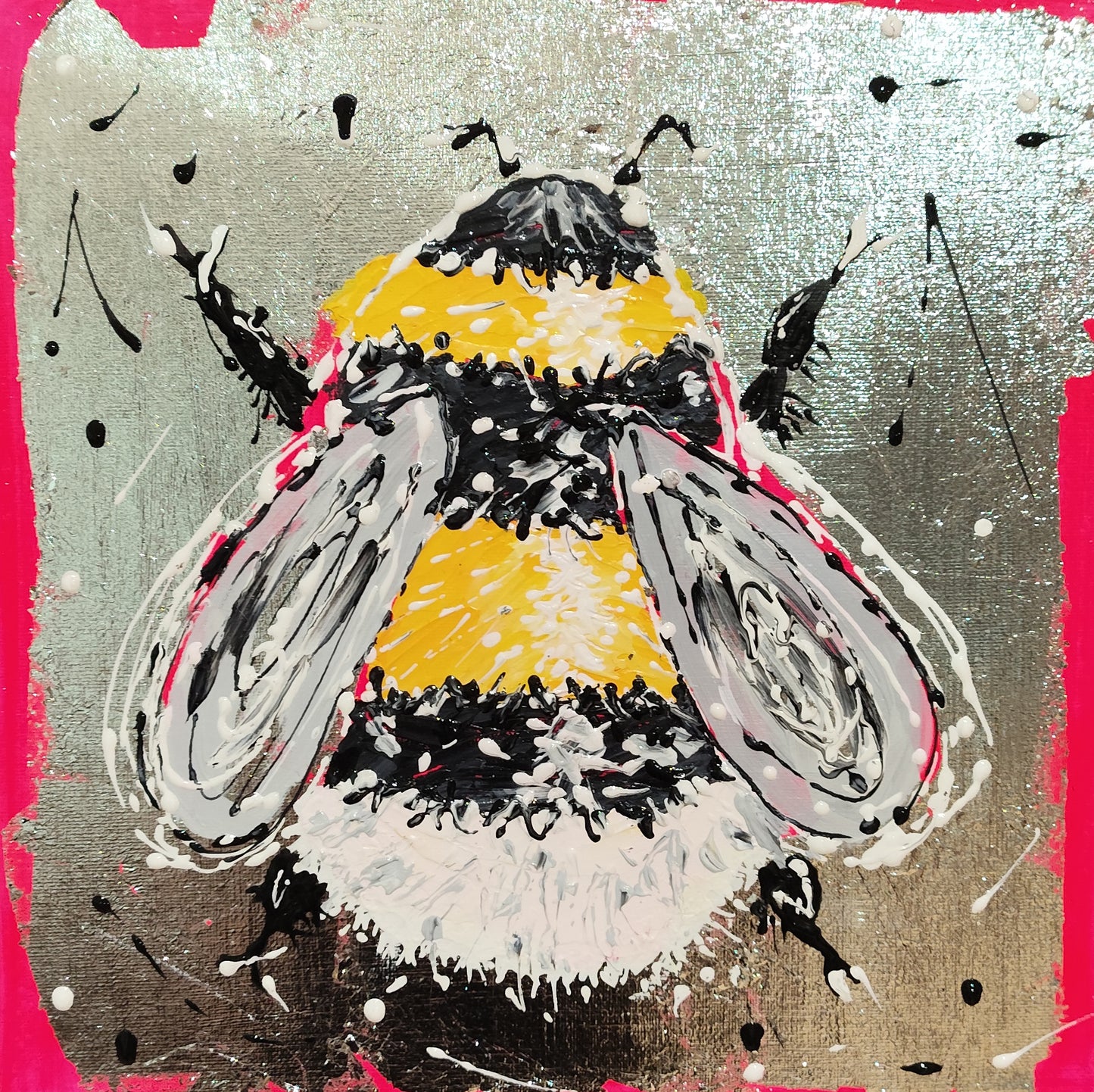 Diesen Abend widmen wir den fleißigen Bienchen und den niedlichen Insekten. Ihr könnt aus verschiedenen Insekten wie Bienchen, Hummeln oder Käfern auswählen. Für dieses Bild experimentieren wir mit abstrakter Malerei und dickem Farbauftrag auf einem Untergrund aus Blattmetall. Ob edel in Gold oder frisch in Silber, das entscheidet ihr nach eurem eigenen Geschmack. Wer möchte, darf auch kleckern, klecksen und sich austoben.