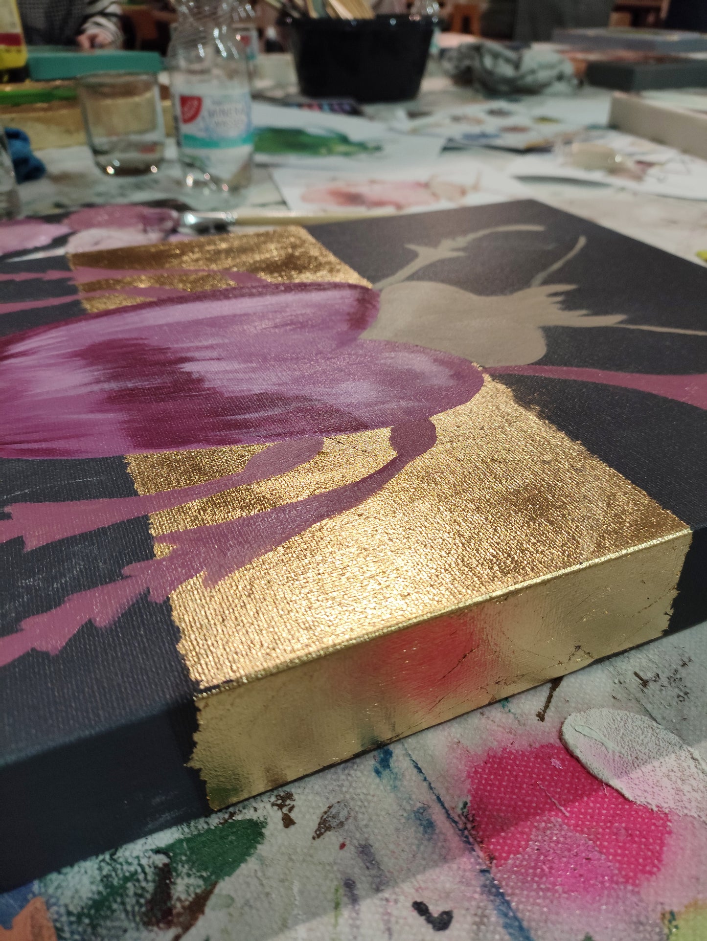 Denkt bitte daran, dass ihr eure Bilder nach dem Kurs transportieren müsst! Manchmal können die Werke in der kurzen Zeit noch nicht vollständig durchtrocknen und sind daher etwas empfindlich. Es empfiehlt sich daher das Bild liegend und geschützt zu transportieren.