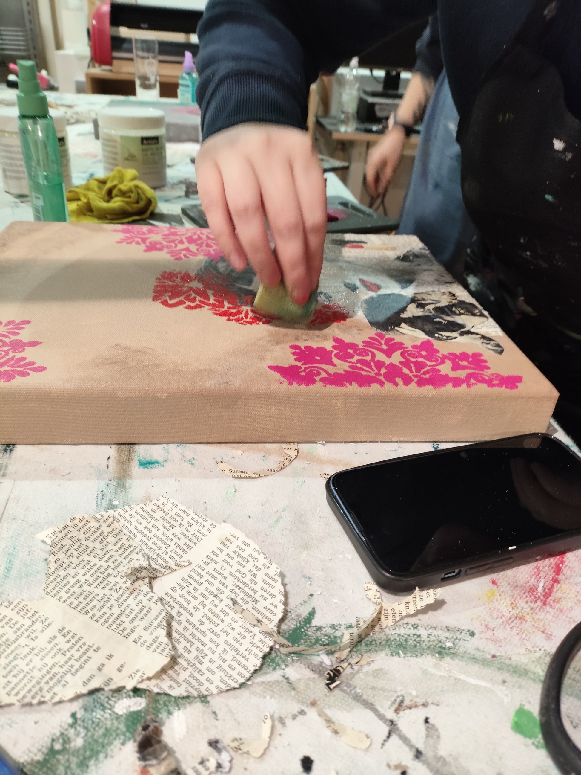 Es gibt Einiges zu entdecken: Acrylfarben mit verschiedenen Konsistenzen, Sprühfarben, verschiedene Malmittel, Gele, Metalle, Pasten, Transferflüssigkeiten, Pigmente, Marker, Collagenmaterial, Schablonen und Vieles mehr. Unsere Keilrahmen sind „Made in Kreis Borken“ und qualitativ sehr hochwertig. Die Kurspreise sind inklusive aller genutzten Materialien, Pinsel und Schickschnack, es werden keine Extrakosten fällig. Ihr braucht nichts mitbringen.